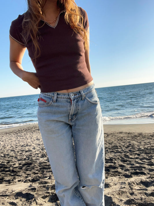 90's STOP HERE USA V-neck shirt brown 1 (SMALL)