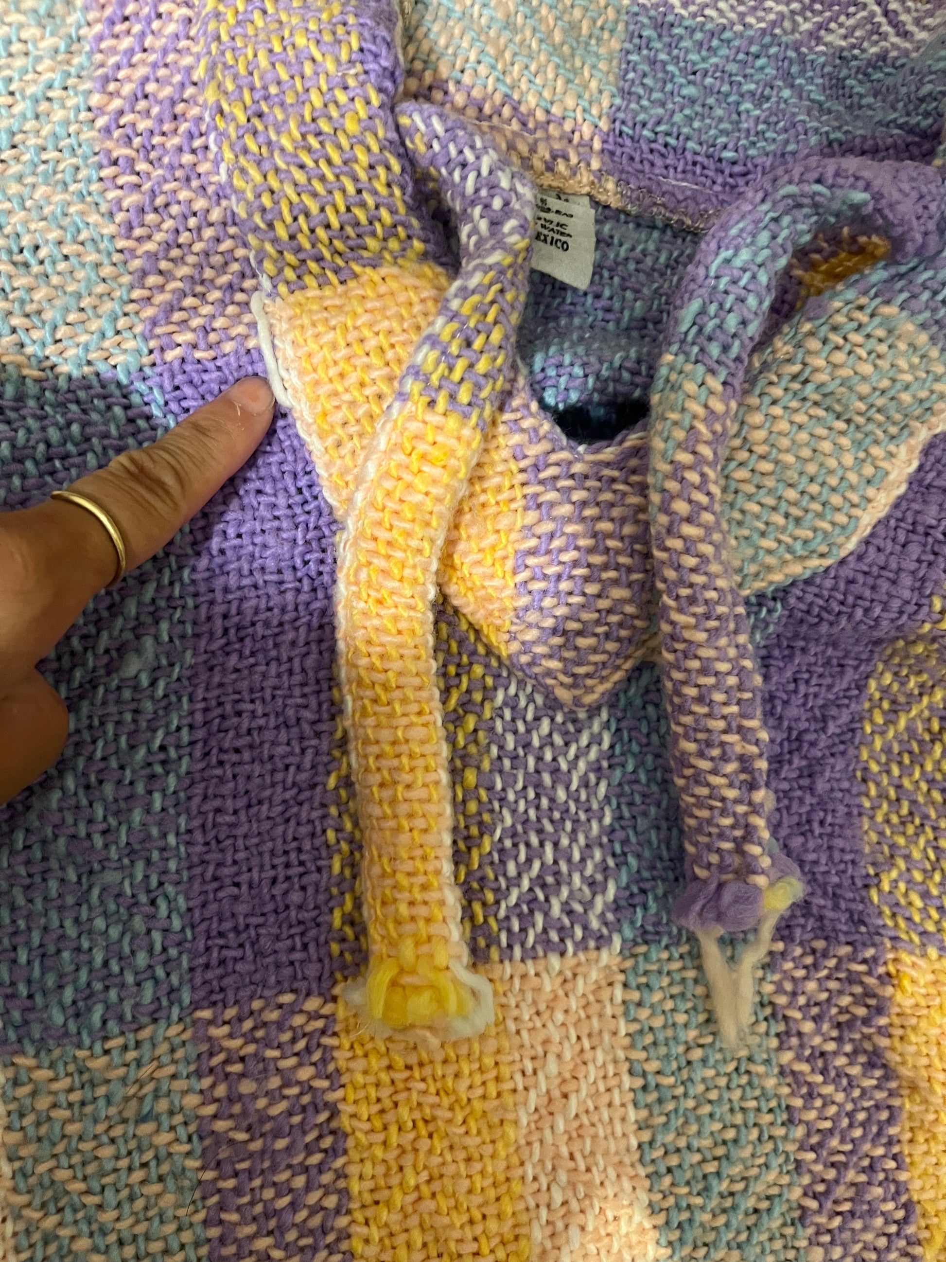 かつてのヒッピー文化やサーフ文化を象徴するアイテムの1つであるメキシカンパーカー。明るいパステルカラーの配色でコーディネイトに取り入れやすい。サイズ感はレディースのXLぐらい。首元が少しほそいので女性向けのサイズです。生地感もしっかりしてるので暖かいです。海上がりにさらっと羽織るのにぴったりです。