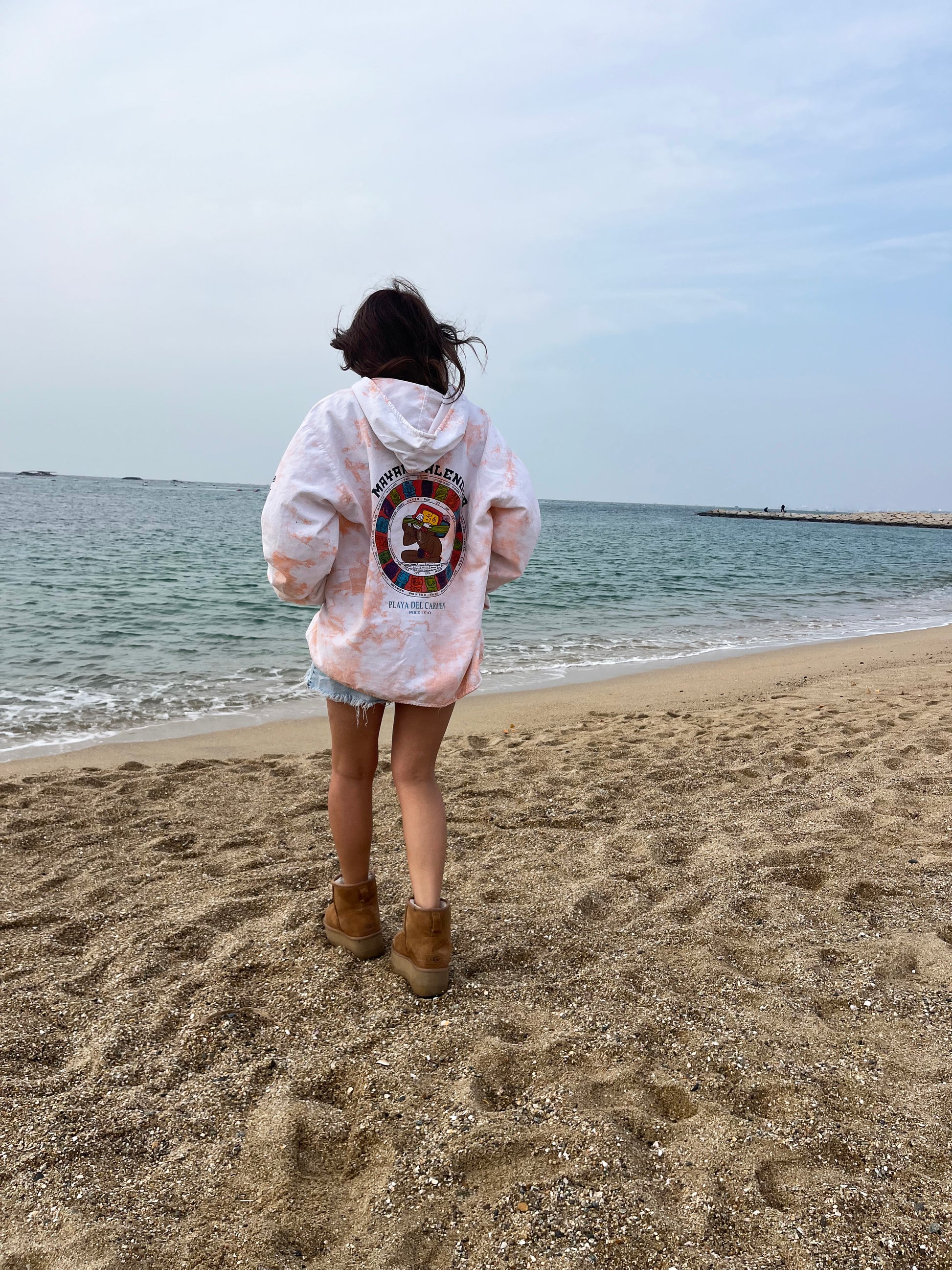 ●詳細:タイダイ染めのビーチパーカー。フロントはシンプルなロゴ、バックプリントはマヤ暦カレンダーのバックプリントです。季節の変わり目にちょうど良い羽織として便利な薄手のパーカー。